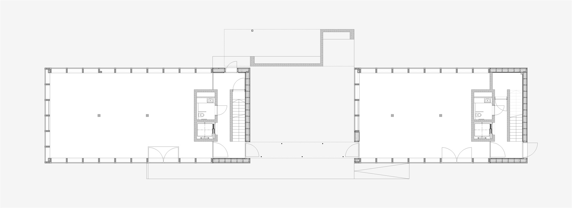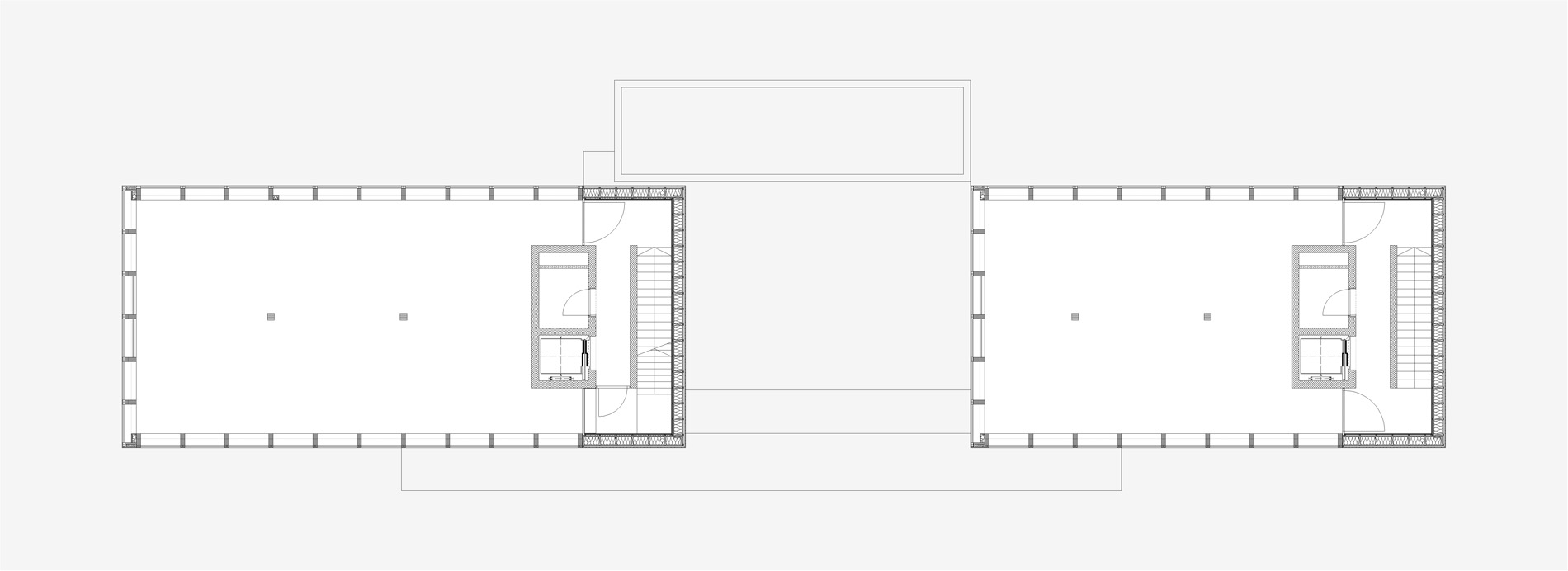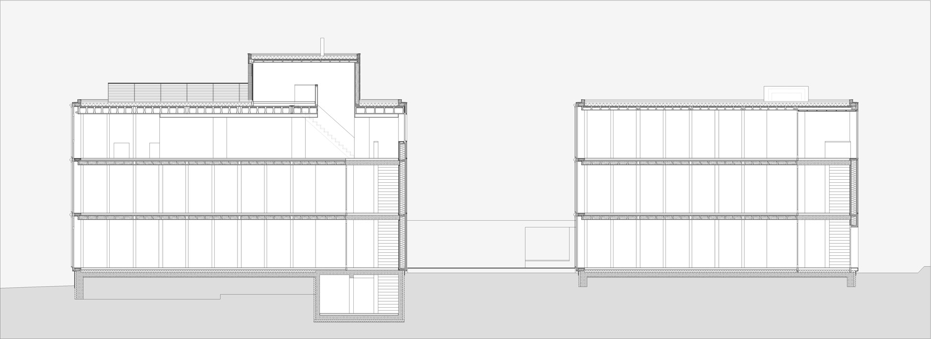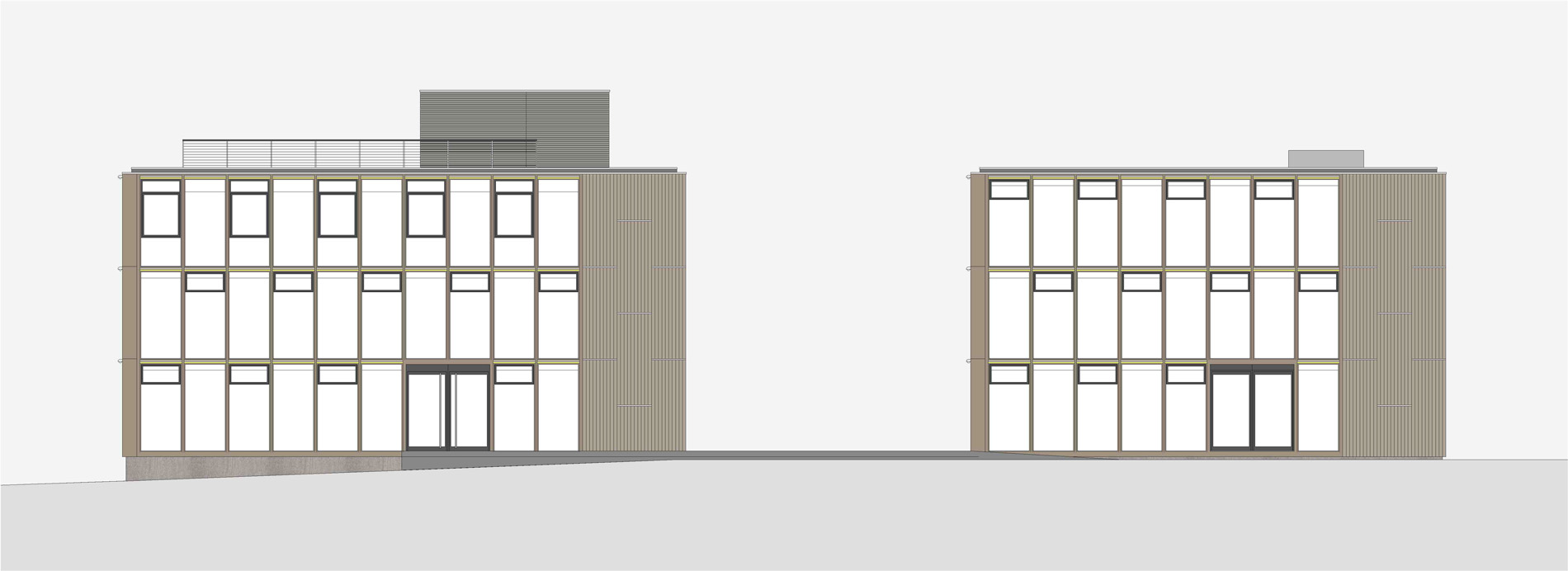 The sketch provides for two separate three-storey buildings constructed with wood. The deep, shelf-like structure of the load-bearing elements gives the building the appearance of an oversized shelf. The building looks like a piece of furniture for furniture, so to speak. On every side, the facade opens up to the main axes and, when viewed as a whole, embodies the idea of a display window and advertising space in one.