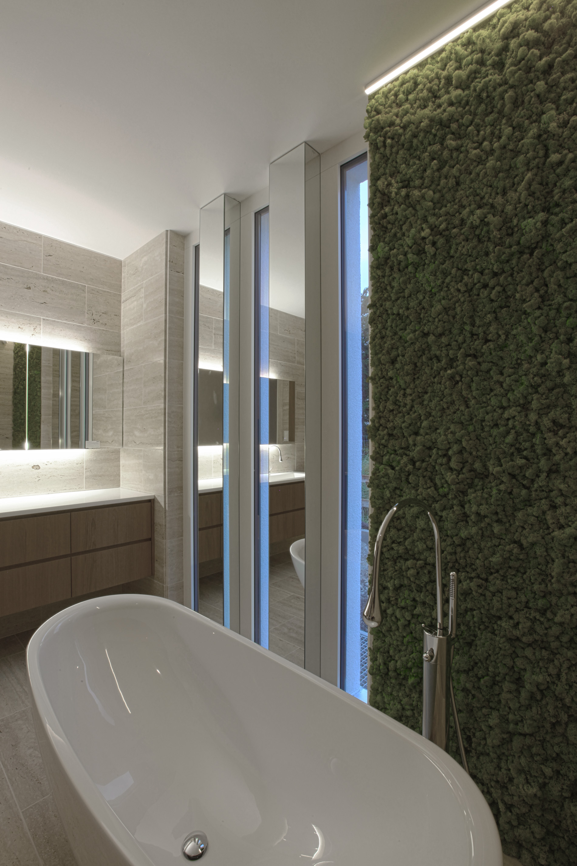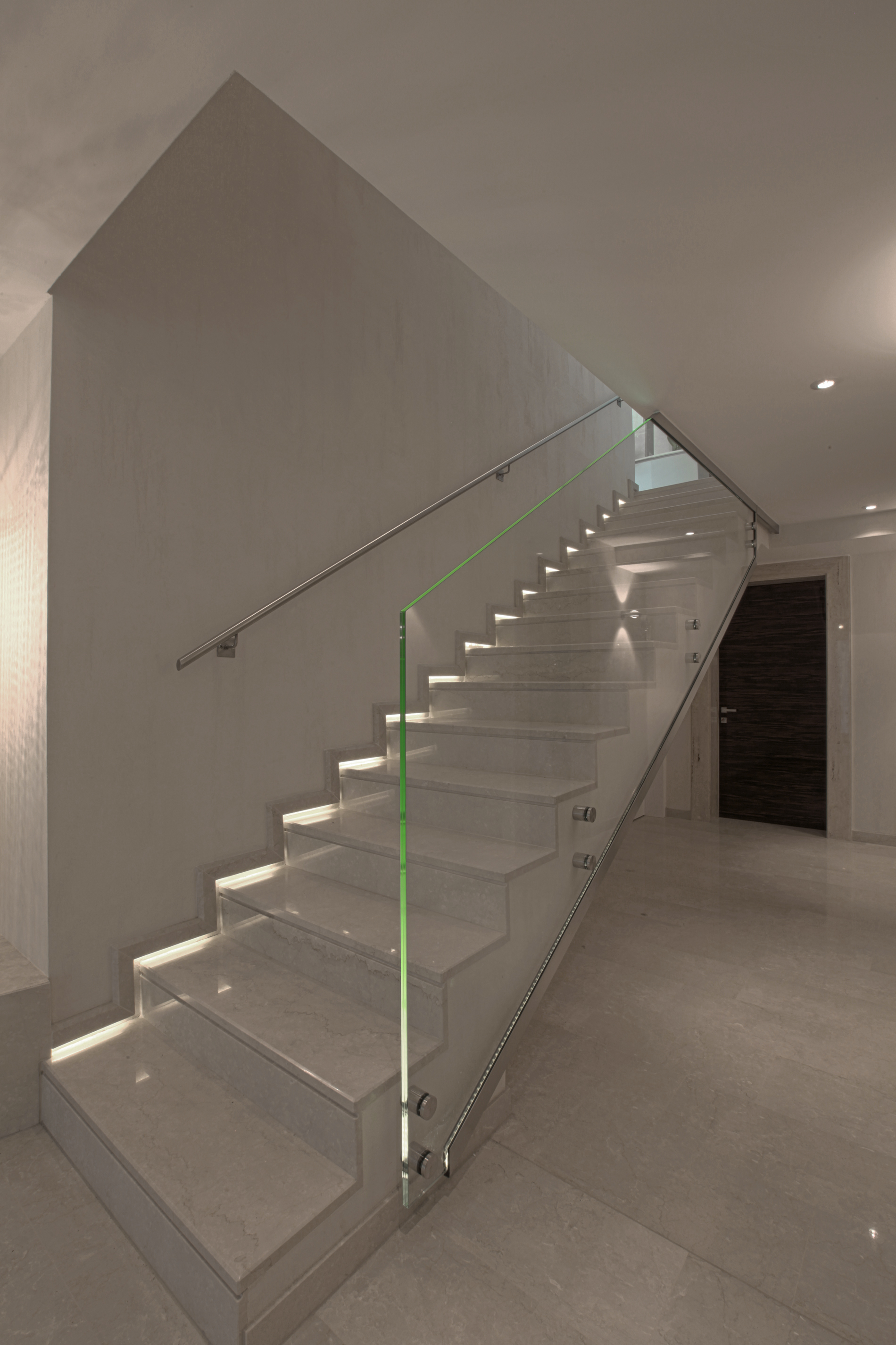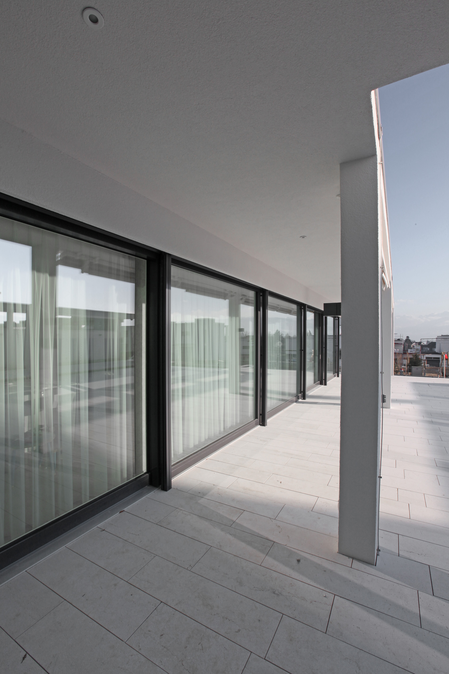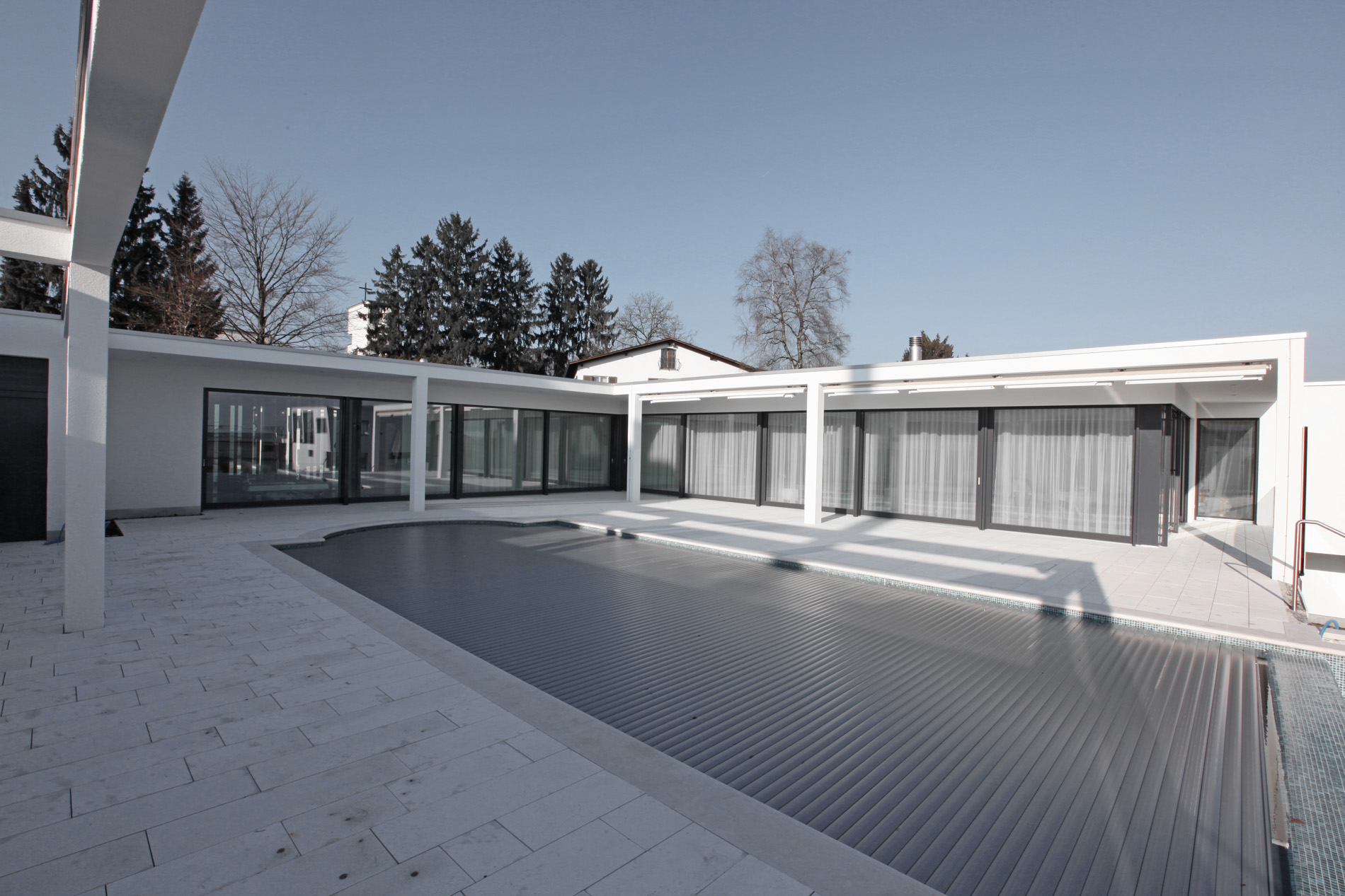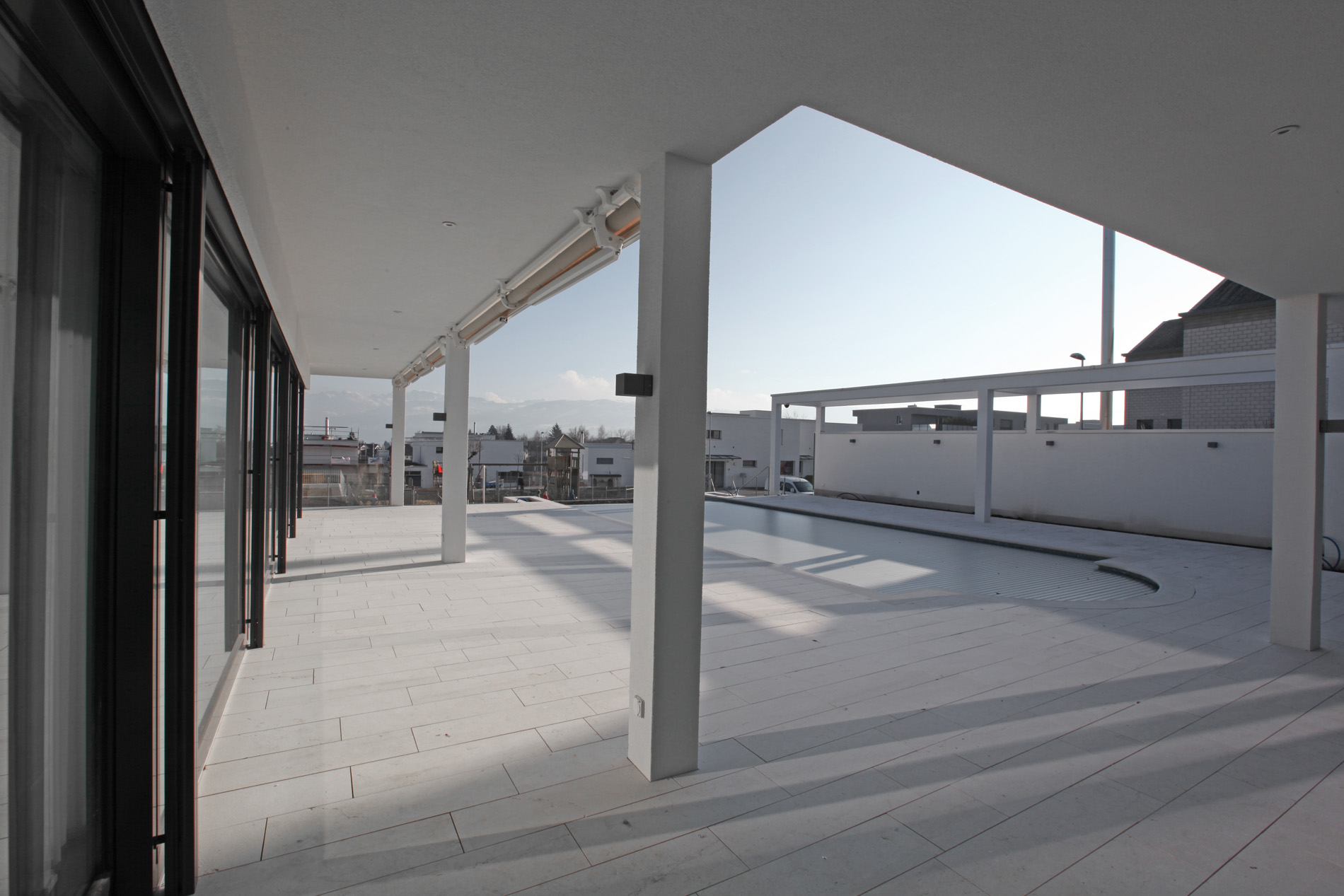According to the blueprints, only two basic colours are used in the outer area. The terrace surfaces in Botticino Classico are subject to this principle. The swimming pool planned as an infinity pool has blue mosaic tiles and creates a colour contrast.