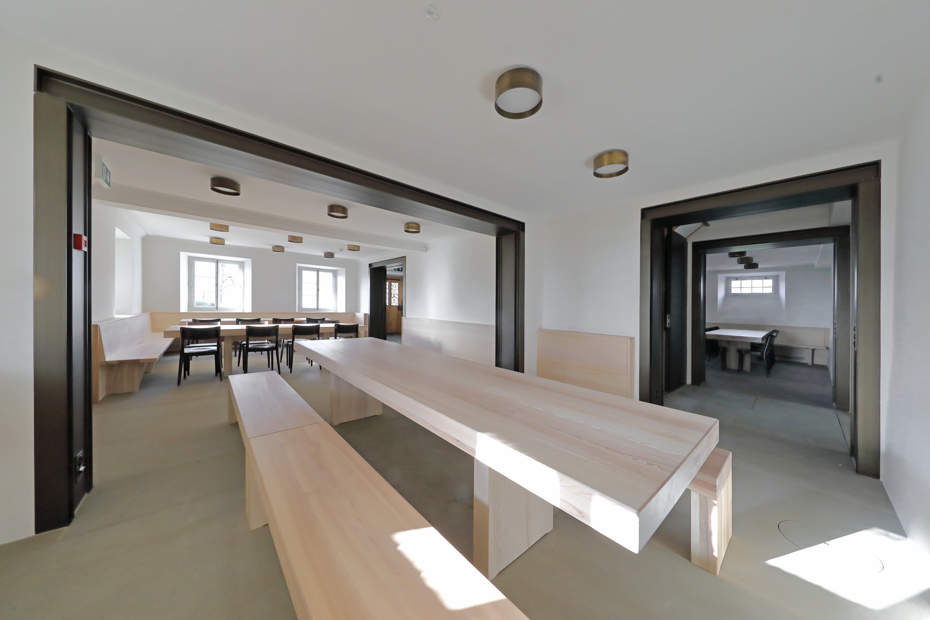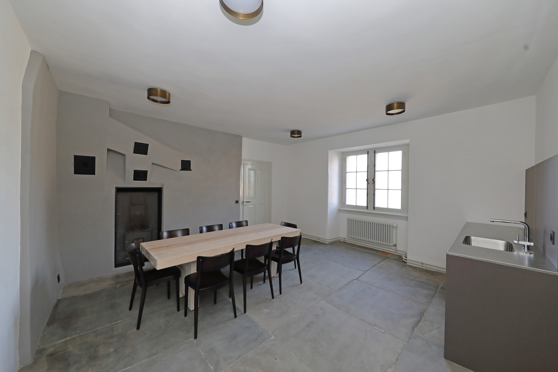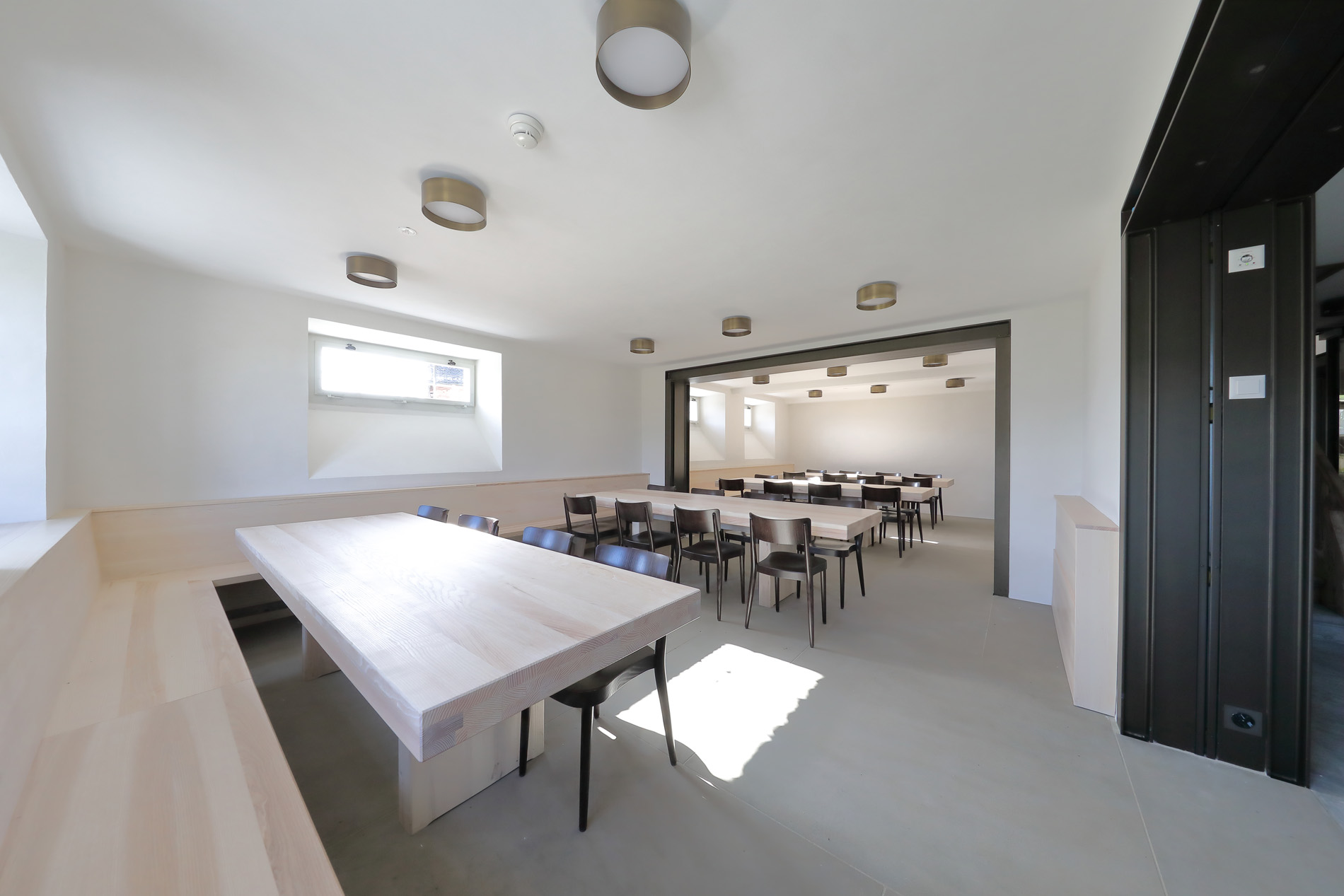The extension from the time of the National Exhibition in 1939 will be used to serve the guesthouse. The restaurant kitchen is on the ground floor, a storage room is in the former hall due to stipulations made by the fire department, and the ventilation station is located in the attic.