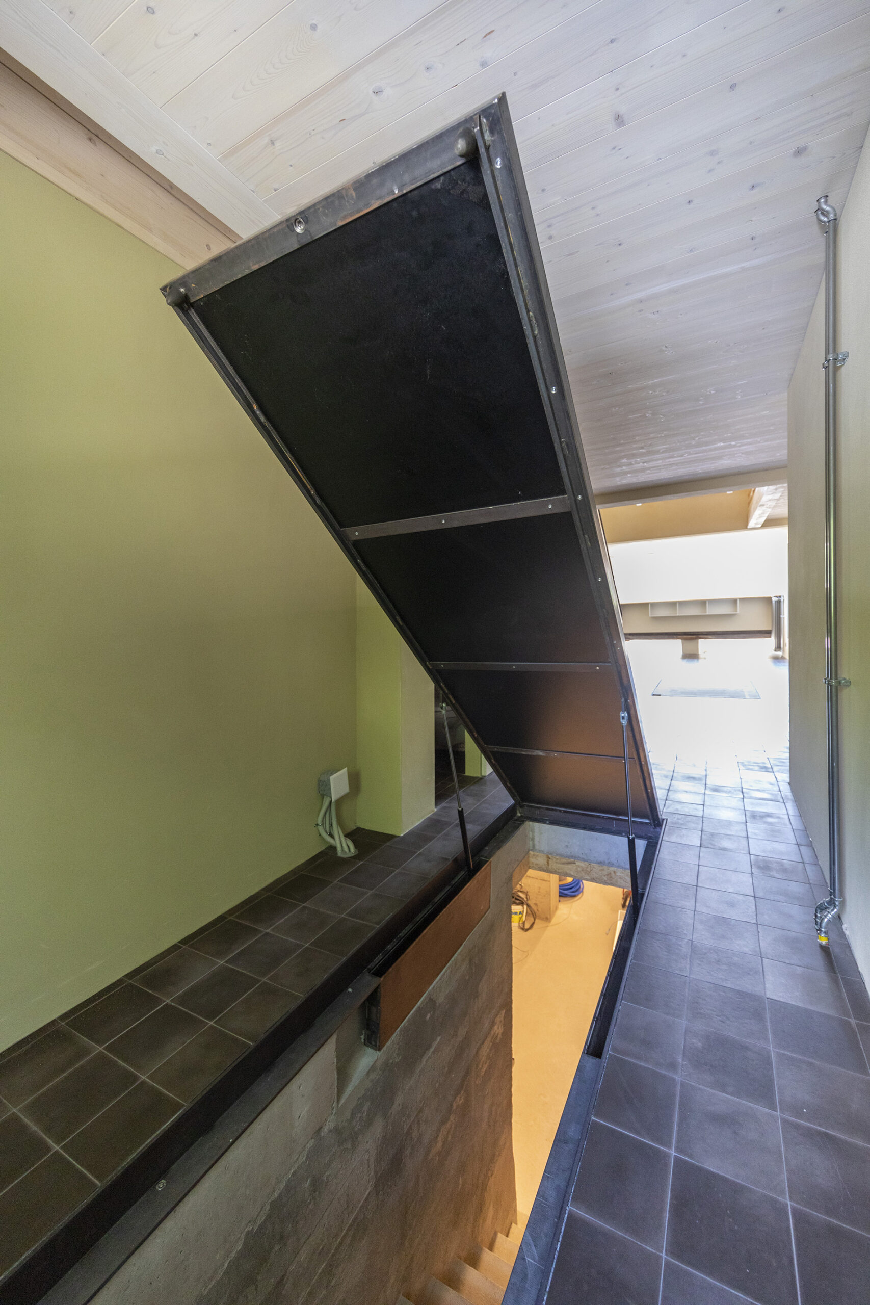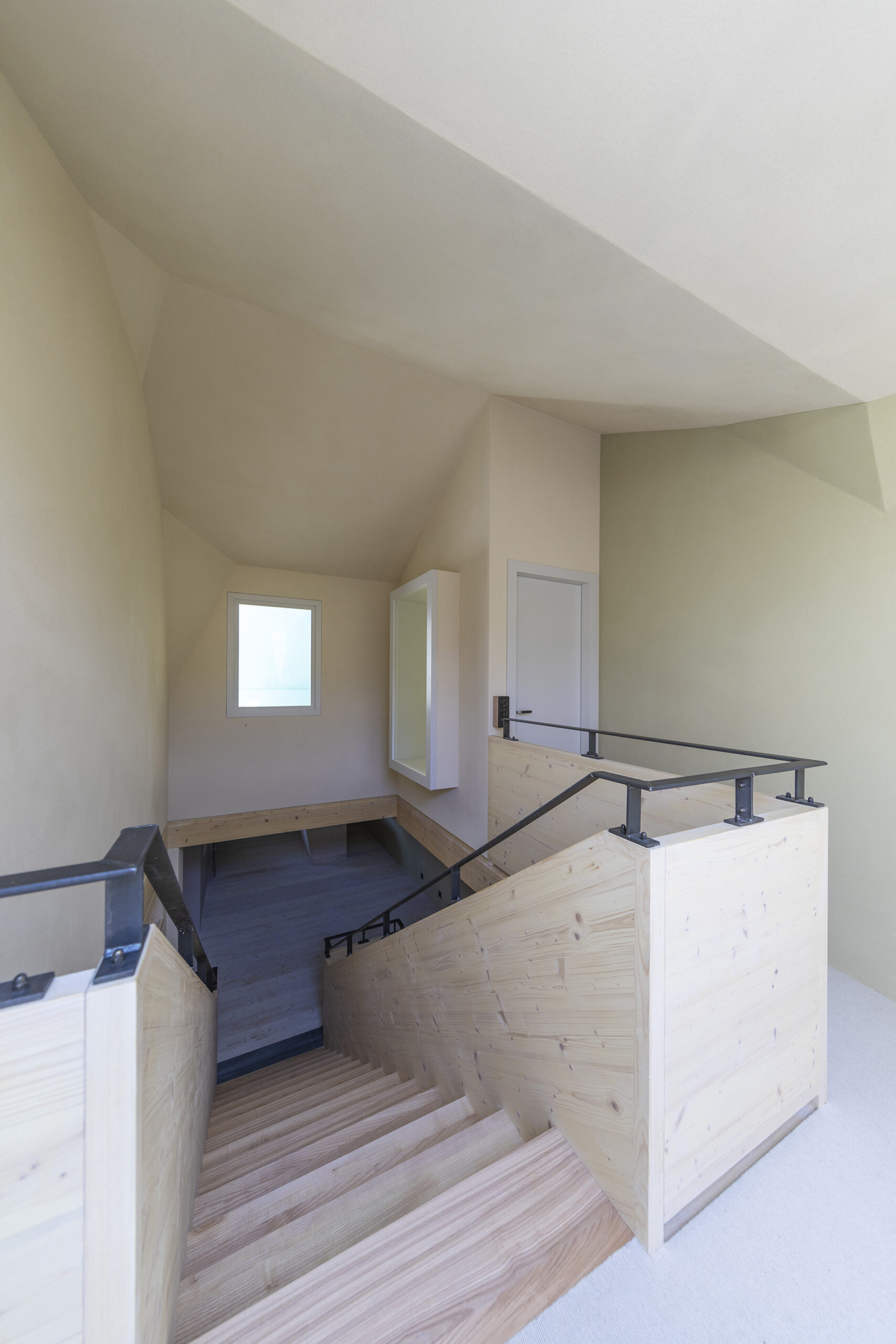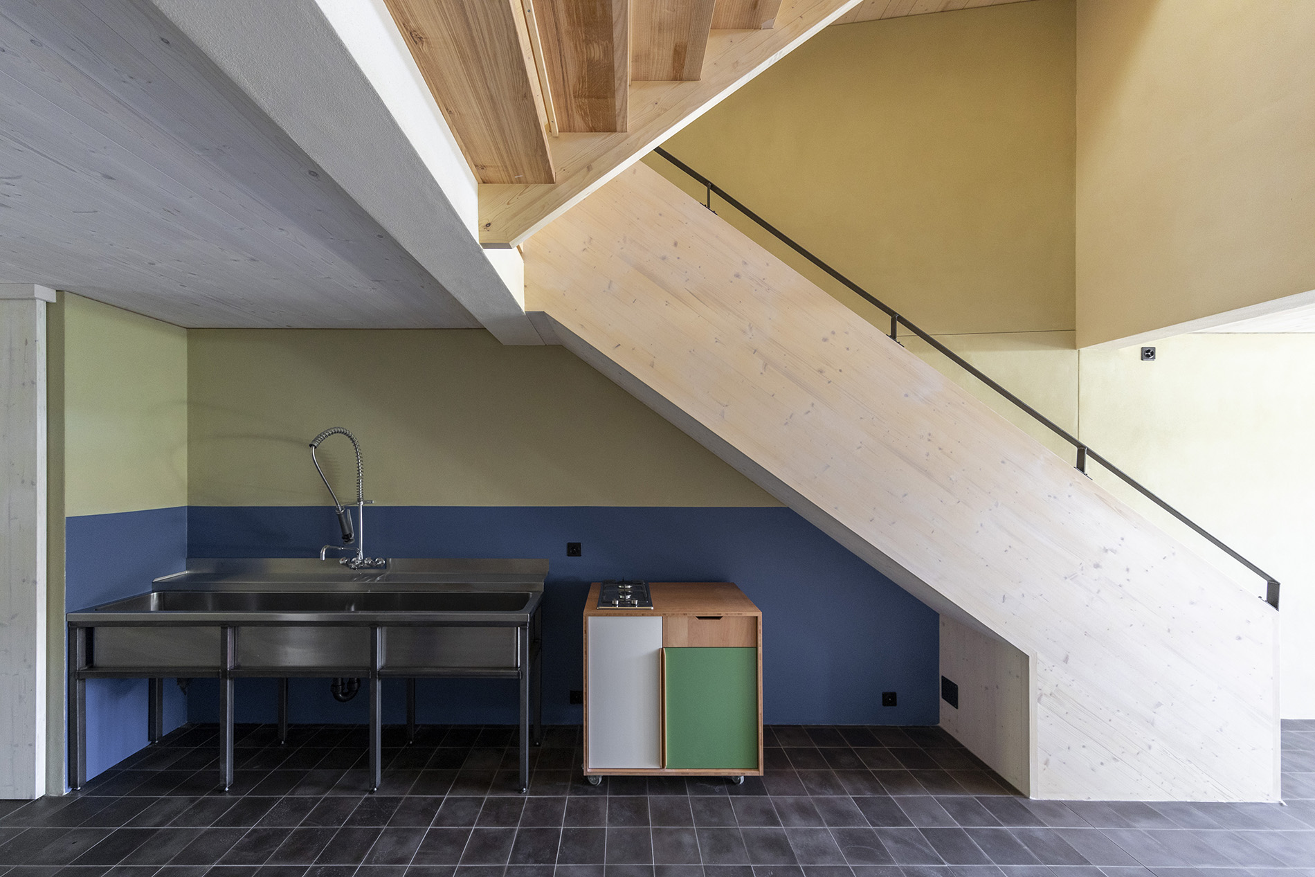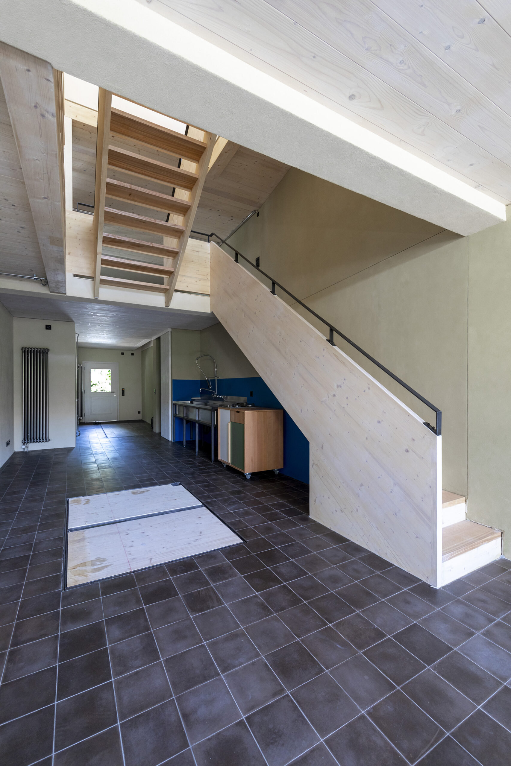 The ground floor will be opened up completely. On the communal wall facing the southern buildings, the access, a kitchenette and a small bathroom are now housed in a uniformly designed box. The floor will be lowered to the level of the passageway. For this purpose, the existing floor has to be demolished and rebuilt. However, the original windows for lighting the basement rooms remain and are now ground floor level windows. The basement will be excavated accordingly and used as a technical and storage room. As before, access will be via an exit covered by a hatch.