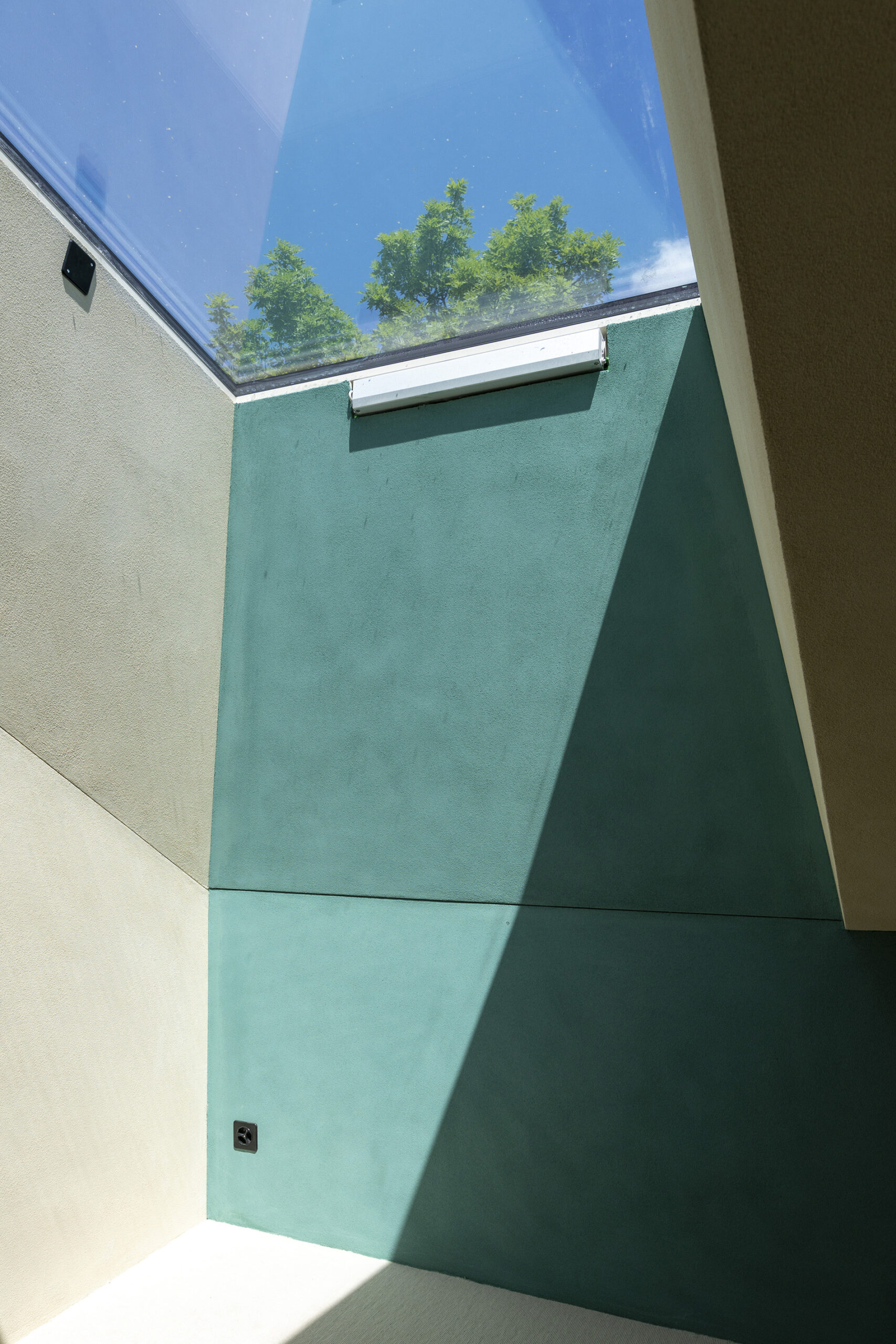 Two bedrooms and a shared bathroom are built into the attic. The rooms are lit via the skylights. Flaps provided in the skylights serve for ventilation and an annual cleaning of the same.